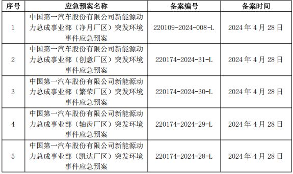 2、一汽旗新動力(長春)科技有限公司突發(fā)環(huán)境事件應急預案及備案表(見附件4-附件10)。
