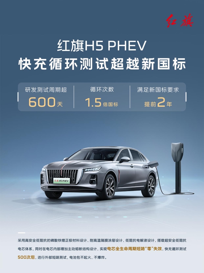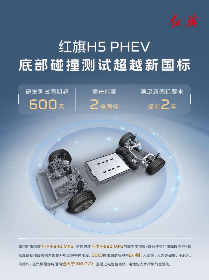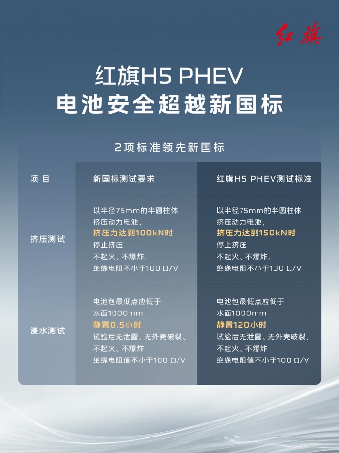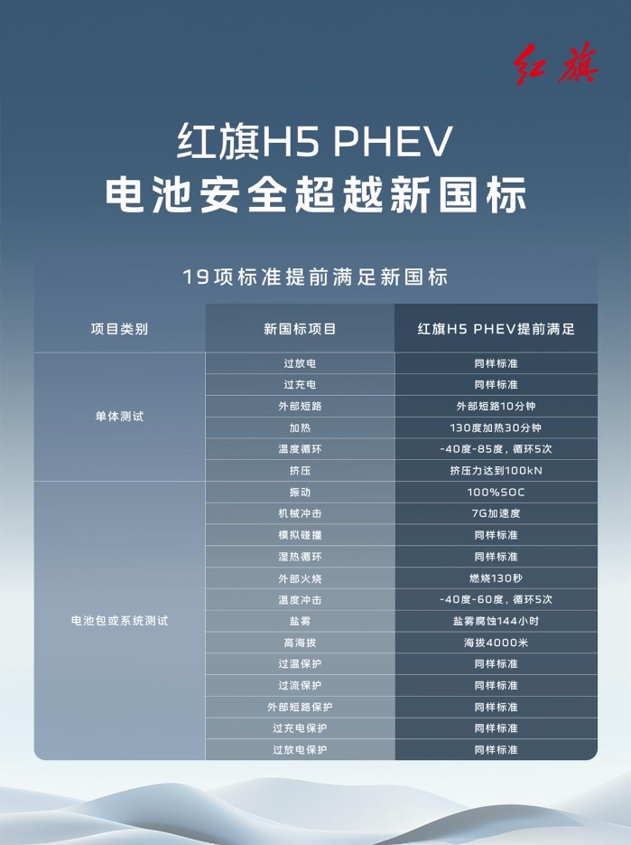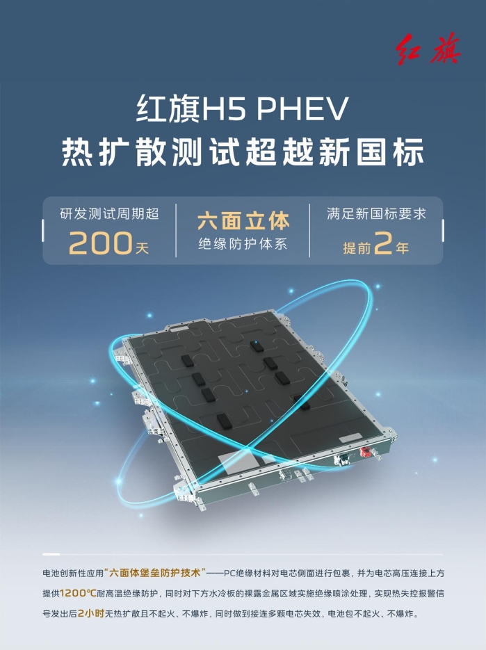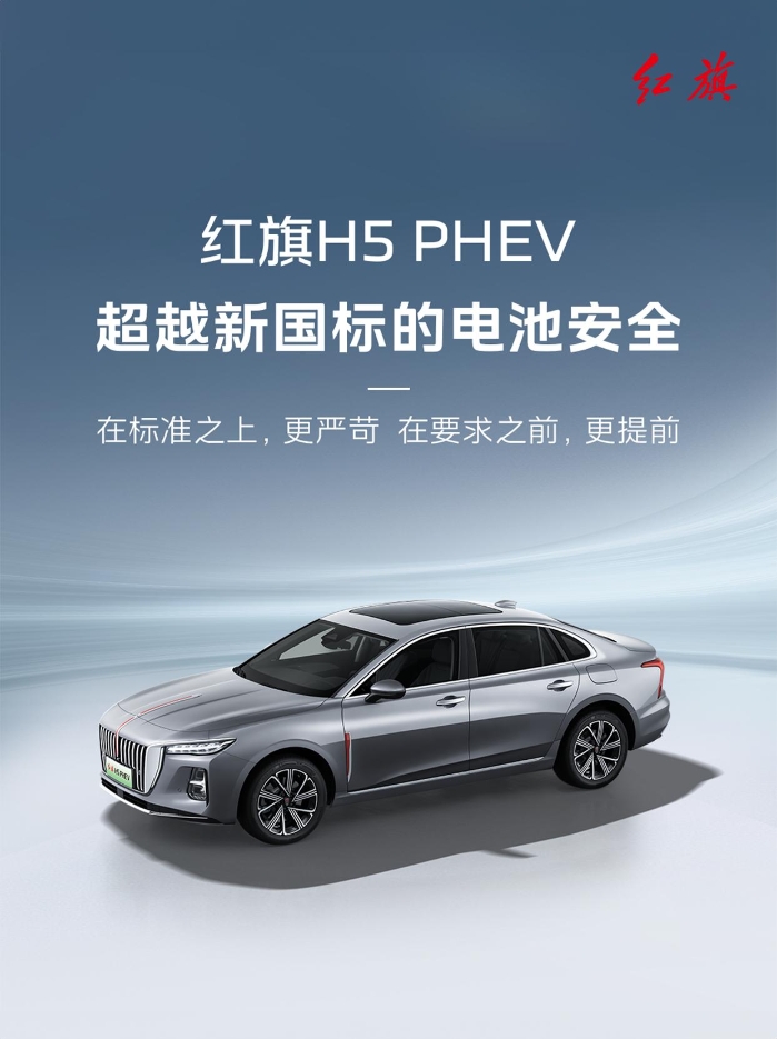 紅旗H5 PHEV動力電池,提前兩年滿足電池安全新國標(biāo)。高標(biāo)準(zhǔn)研發(fā),嚴(yán)手段驗證。紅旗汽車,時刻守護你的每一次出行。
