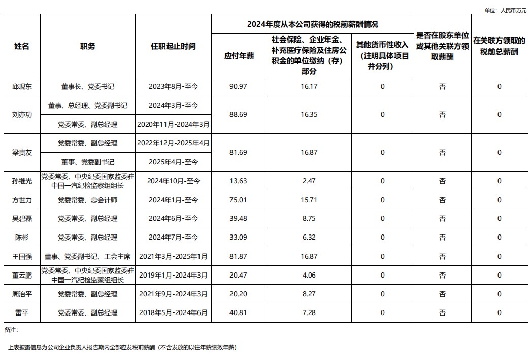中國第一汽車集團有限公司企業(yè)負(fù)責(zé)人2024年度薪酬情況
