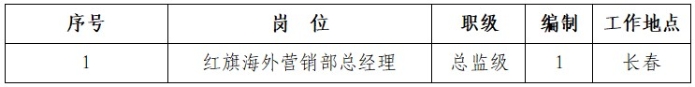 根據(jù)工作需要,現(xiàn)對(duì)中國(guó)第一汽車集團(tuán)進(jìn)出口有限公司紅旗海外營(yíng)銷部總經(jīng)理崗位面向社會(huì)公開招聘,具體內(nèi)容如下: