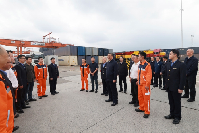 4月22日至24日,中共中央總書記、國家主席、中央軍委主席習近平在重慶考察。這是22日下午,習近平在重慶國際物流樞紐園區(qū)重慶鐵路集裝箱中心站,同貨車司機、列車司機、裝卸工人、場站管理人員等親切交流。