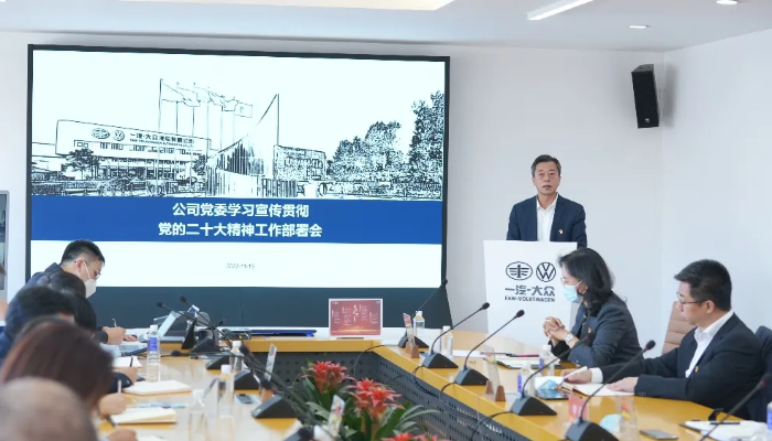 會議傳達(dá)了集團公司黨委關(guān)于學(xué)習(xí)宣傳貫徹黨的二十大精神的工作要求,并從學(xué)習(xí)研討、專題培訓(xùn)、宣講交流、宣傳引領(lǐng)、全員貫徹、實踐落實六個方面對《一汽-大眾公司黨委學(xué)習(xí)宣傳貫徹黨的二十大精神工作方案》進(jìn)行說明、部署工作。