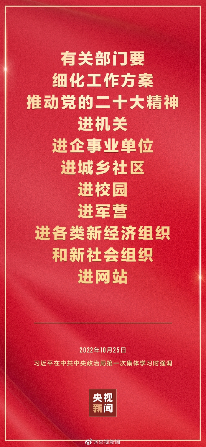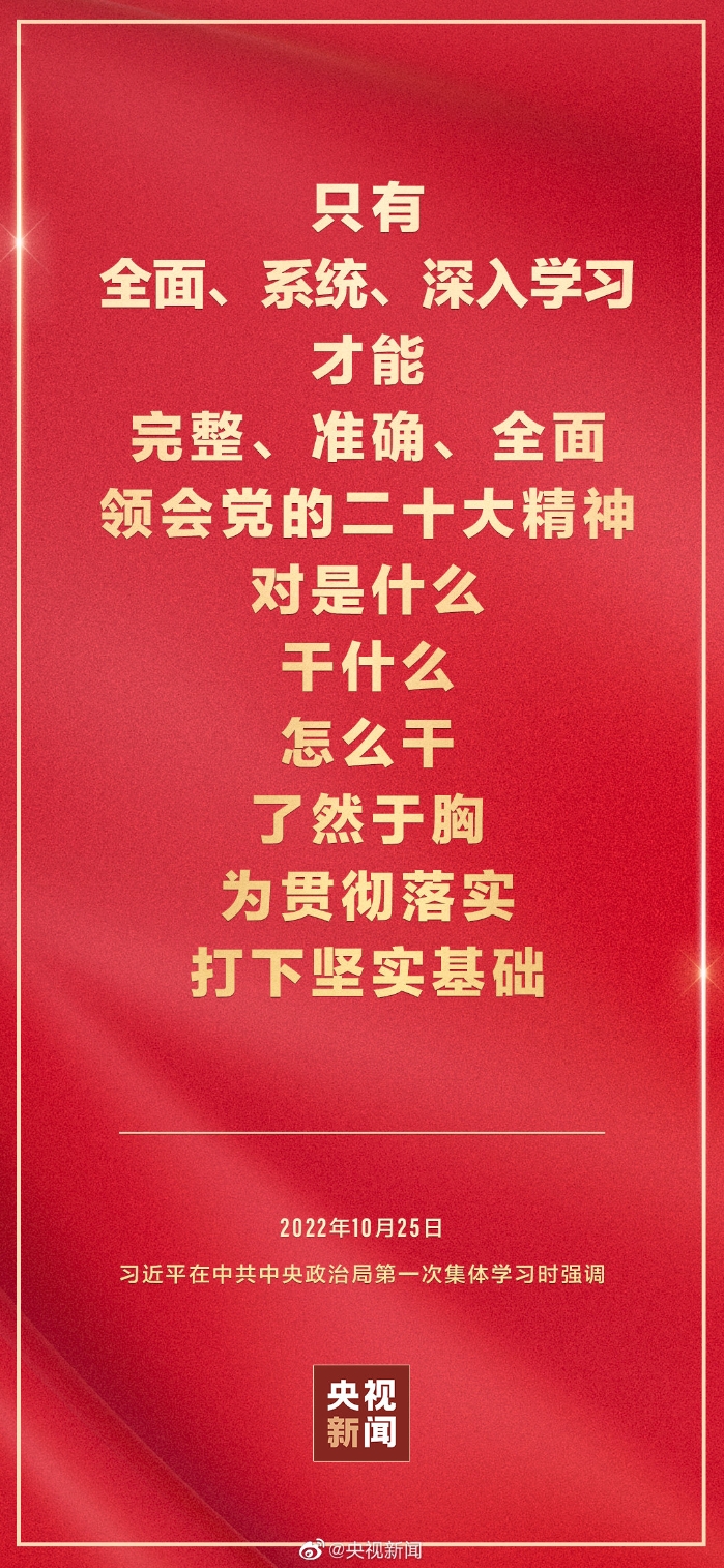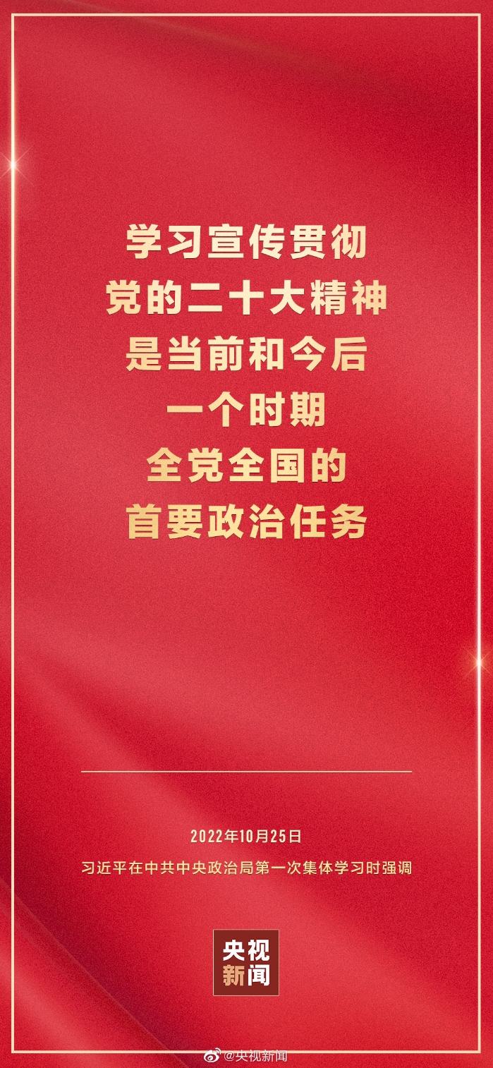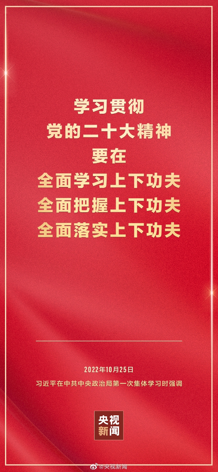 二十屆中共中央政治局10月25日下午就學(xué)習(xí)貫徹黨的二十大精神進(jìn)行第一次集體學(xué)習(xí)。中共中央總書記習(xí)近平在主持學(xué)習(xí)時(shí)強(qiáng)調(diào),全黨要在全面學(xué)習(xí)、全面把握、全面落實(shí)上下功夫,堅(jiān)定不移把黨的二十大提出的目標(biāo)任務(wù)落到實(shí)處,奮力奪取全面建設(shè)社會(huì)主義現(xiàn)代化國家新勝利。