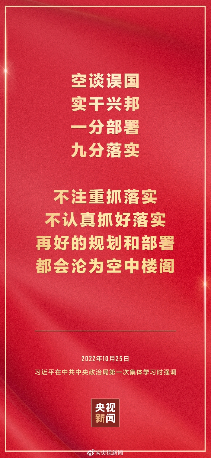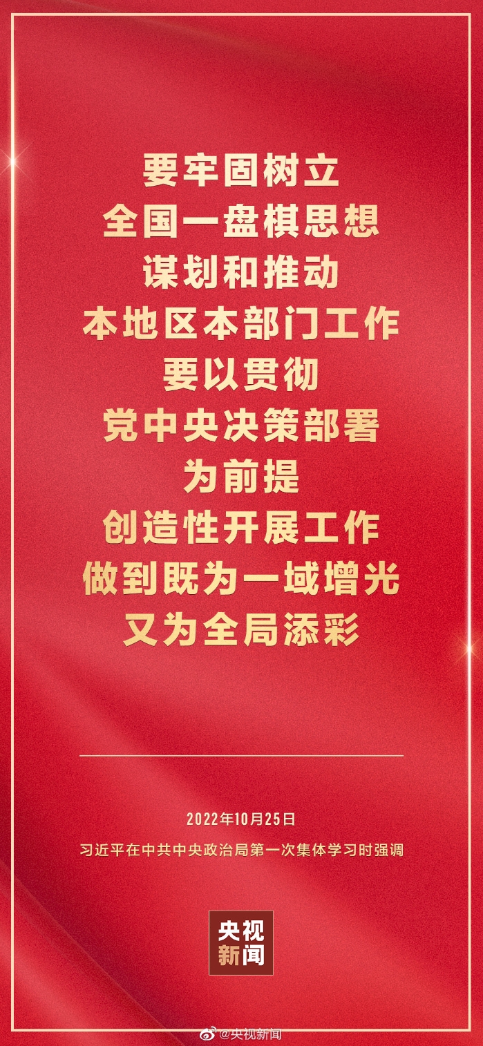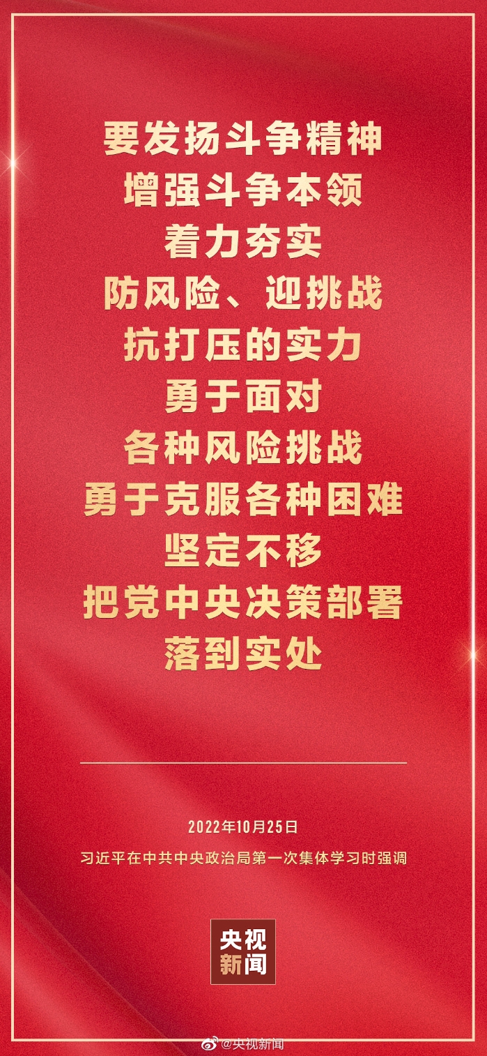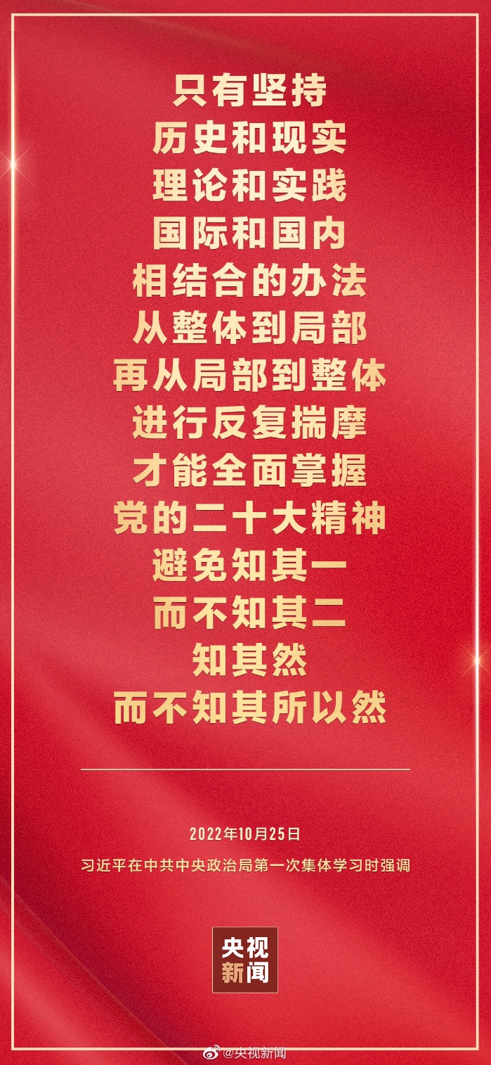 二十屆中共中央政治局10月25日下午就學(xué)習(xí)貫徹黨的二十大精神進(jìn)行第一次集體學(xué)習(xí)。中共中央總書記習(xí)近平在主持學(xué)習(xí)時(shí)強(qiáng)調(diào),全黨要在全面學(xué)習(xí)、全面把握、全面落實(shí)上下功夫,堅(jiān)定不移把黨的二十大提出的目標(biāo)任務(wù)落到實(shí)處,奮力奪取全面建設(shè)社會(huì)主義現(xiàn)代化國家新勝利。
